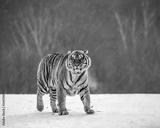 Siberian tiger walks in a snowy glade in a hard frost. Very unusual image. China. Harbin. Mudanjiang province. Hengdaohezi park. Siberian Tiger Park. Winter. (Panthera tgris altaica)