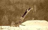 Siberian tiger in a jump catches its prey. Very dynamic shot. China. Harbin. Mudanjiang province. Hengdaohezi park. Siberian Tiger Park. Winter. Hard frost. (Panthera tgris altaica)