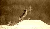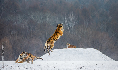 Siberian tiger in a jump catches its prey. Very dynamic shot. China. Harbin. Mudanjiang province. Hengdaohezi park. Siberian Tiger Park. Winter. Hard frost. (Panthera tgris altaica)