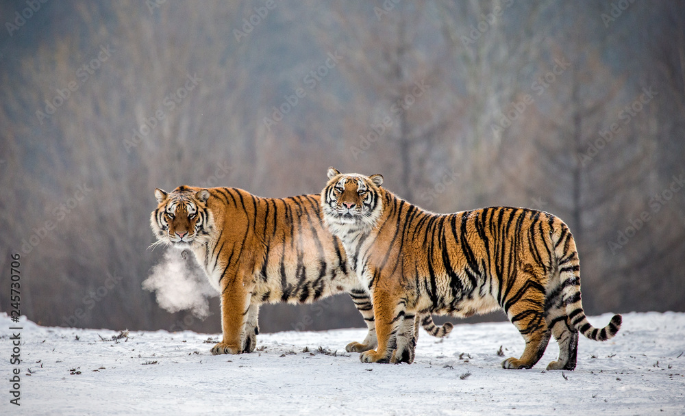 Pair of Siberian tigers in a snowy glade. China. Harbin. Mudanjiang province. Hengdaohezi park. Siberian Tiger Park. Winter. Hard frost. (Panthera tgris altaica)