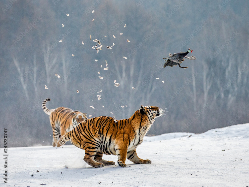 Siberian tigers in a snowy glade catch their prey. Very dynamic shot. China. Harbin. Mudanjiang province. Hengdaohezi park. Siberian Tiger Park. Winter. Hard frost. (Panthera tgris altaica)
