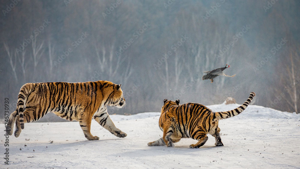 Siberian tigers in a snowy glade catch their prey. Very dynamic shot. China. Harbin. Mudanjiang province. Hengdaohezi park. Siberian Tiger Park. Winter. Hard frost. (Panthera tgris altaica)