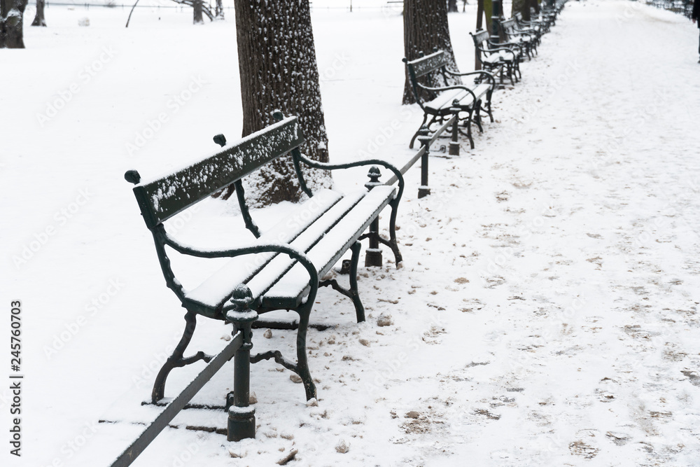 row of wood bench cover by white snow in the garden with walkway background