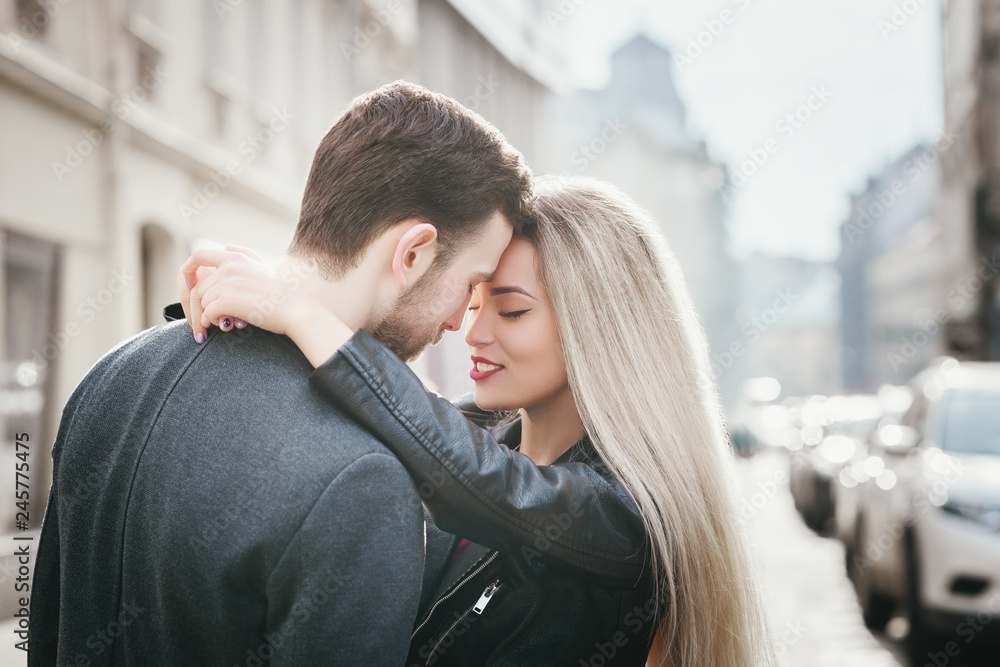 Happy embracing couple posing in street of european city. Copy, empty space for text