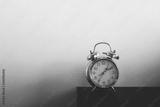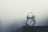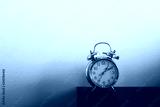Retro alarm clock on table. Vintage style slate blue photo