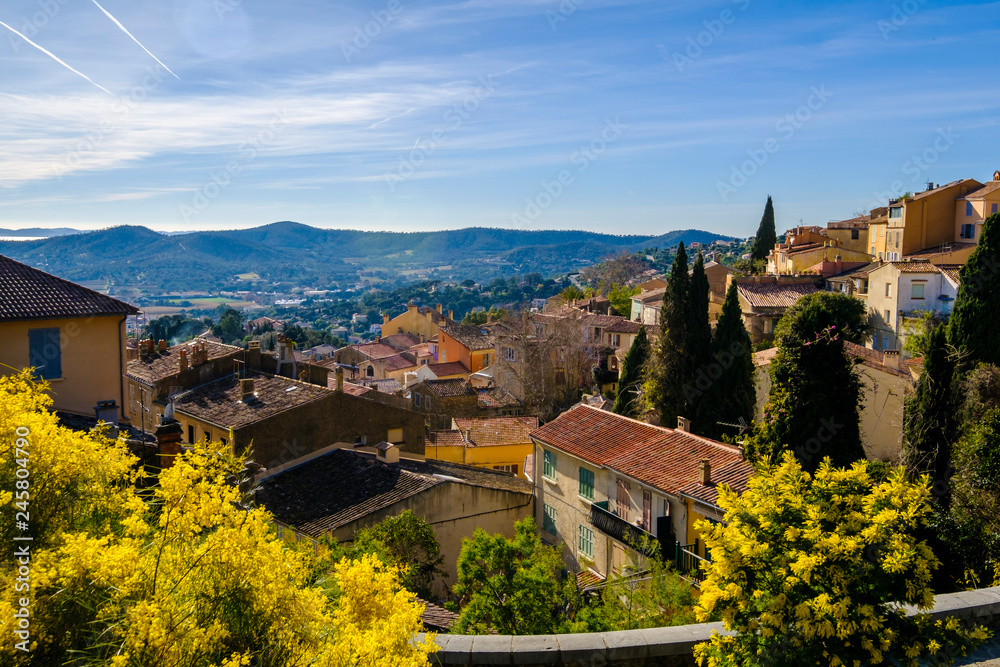 Vue panoramique sur le village de Bormes-les-Mimosas. Arbres de mimosa en fleurs.