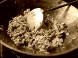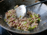 Cooking pork stir fried with Thai chili paste in a hot wok at home