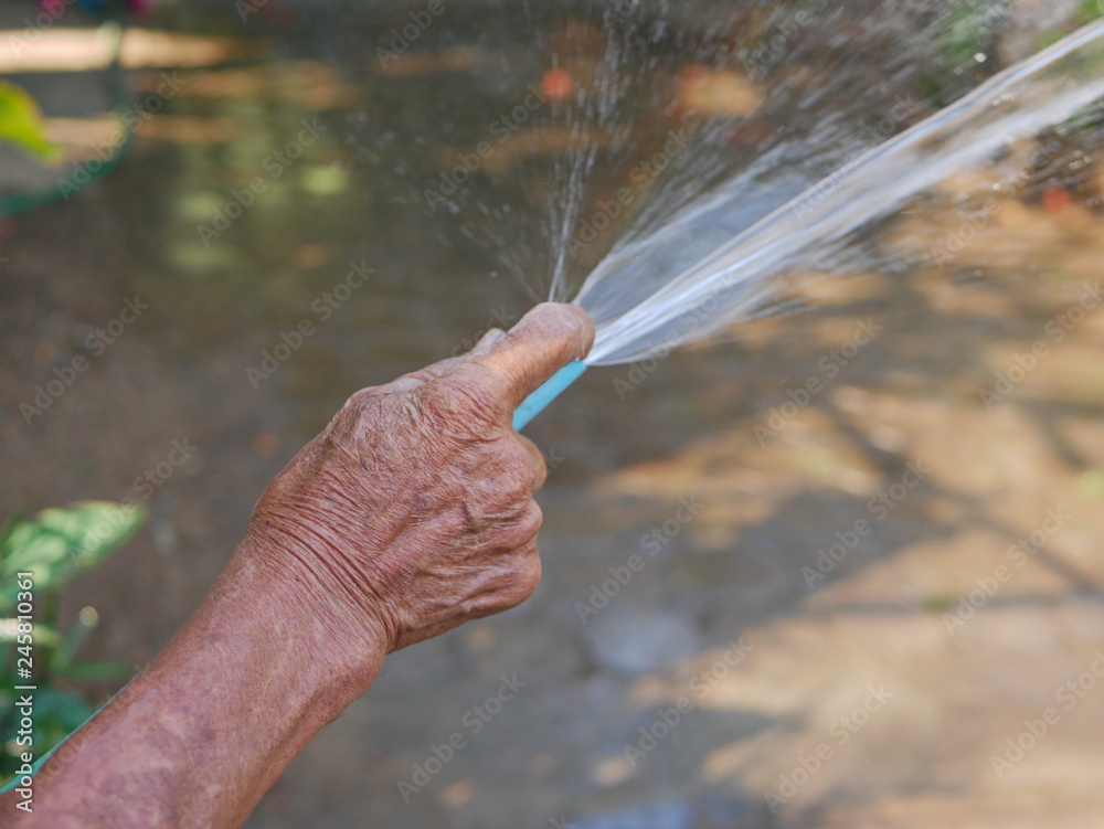 Close up of an old farmer / man's hand watering plants