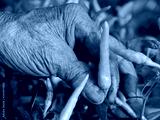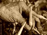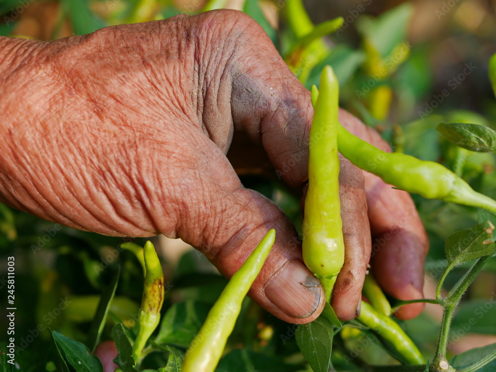 Old grungy hard-working farmer's hand picking fresh green chili, a beautiful outcome from his hard work