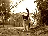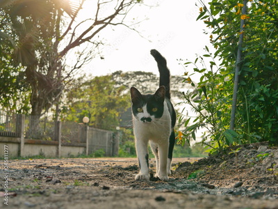 Selective focus of a cat walking on the side of a dirt road in front of a house in the evening