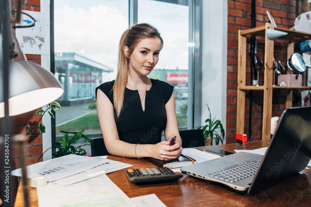 Business woman working at the office looking at camera.