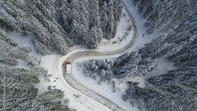 Curving, Winding, Winter, Mountain Road with a Truck Minibus
