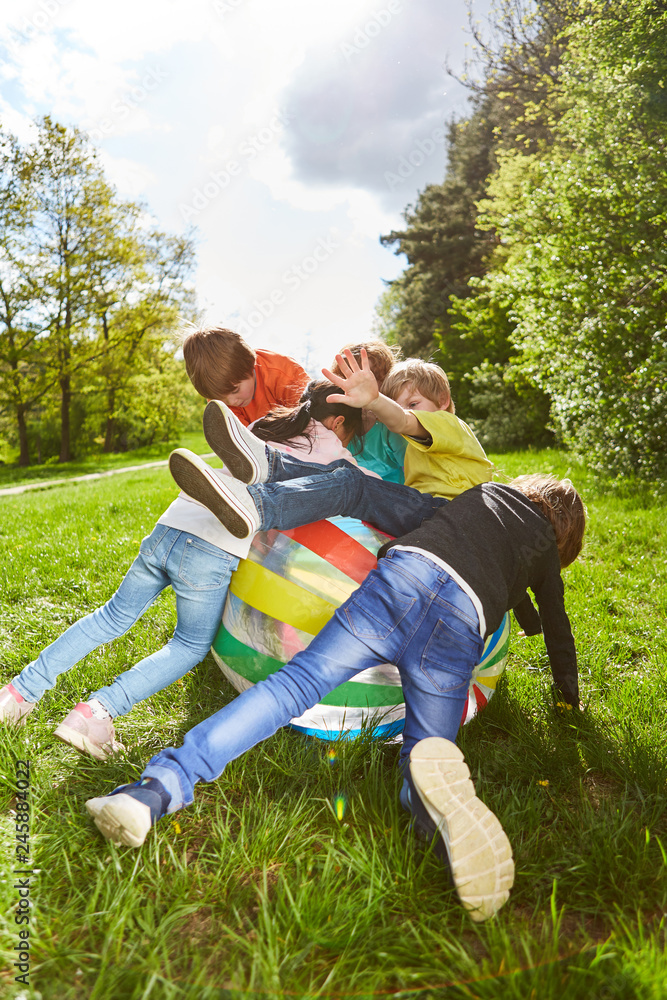 Gruppe Kinder tobt mit einem bunten Ball herum