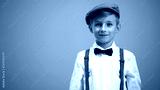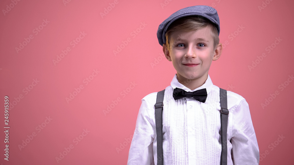 Little gentleman in vintage clothes surprisingly looking into camera, happiness