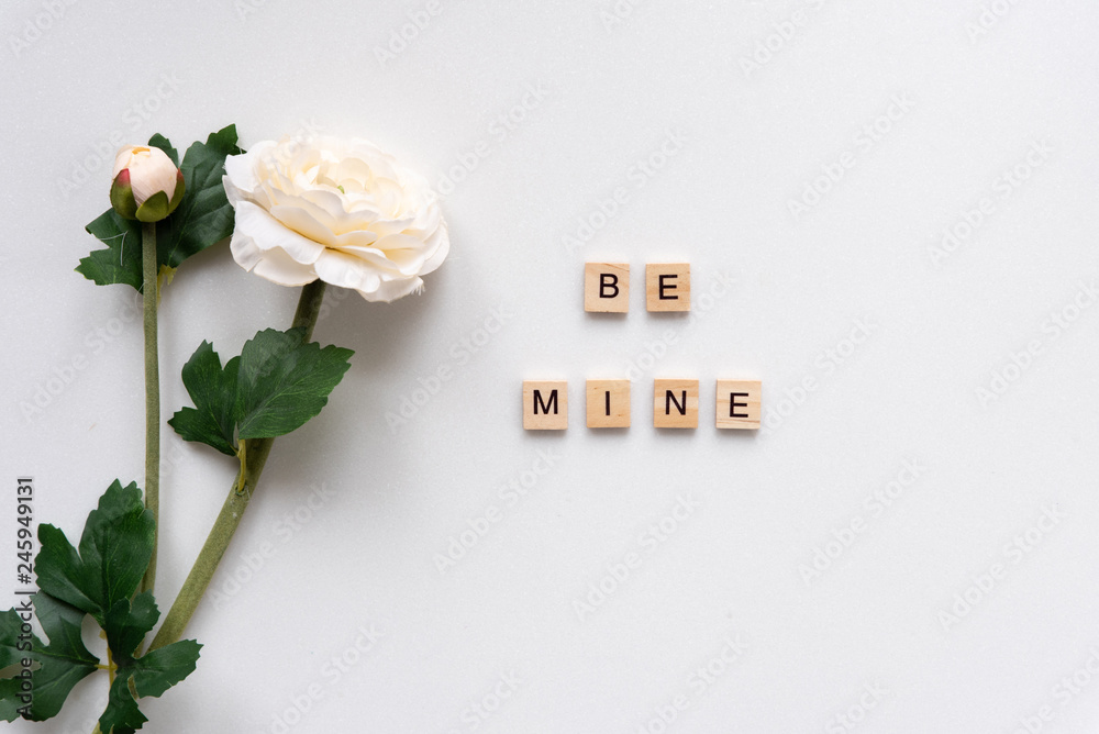 Be mine words on white marble background.
