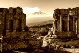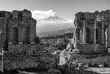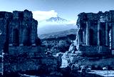 Volcano Etna seen through ruins of ancient Greek amphitheater in Taormina in Sicily