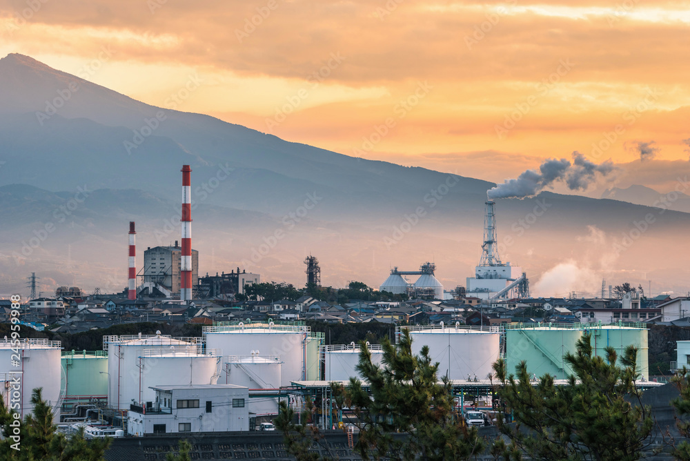 Factory in industry zone at sunset Shizuoka prefecture, Japan.