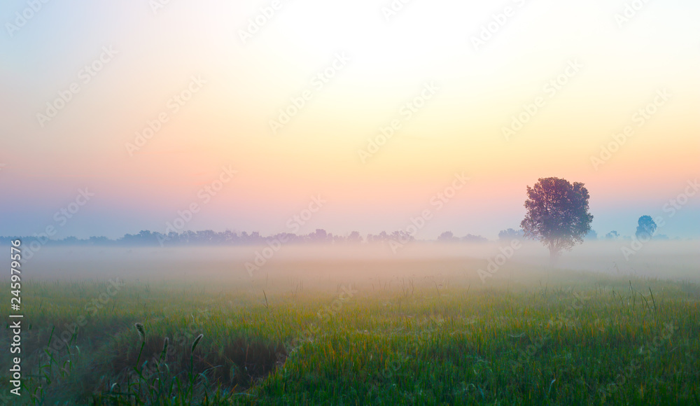 Landscape meadow with tree dramatic sky fog and beautiful autumn morning