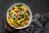 Tagliatelle pasta with kale, tomatoes, pepper and parmesan cheese. Dark background.