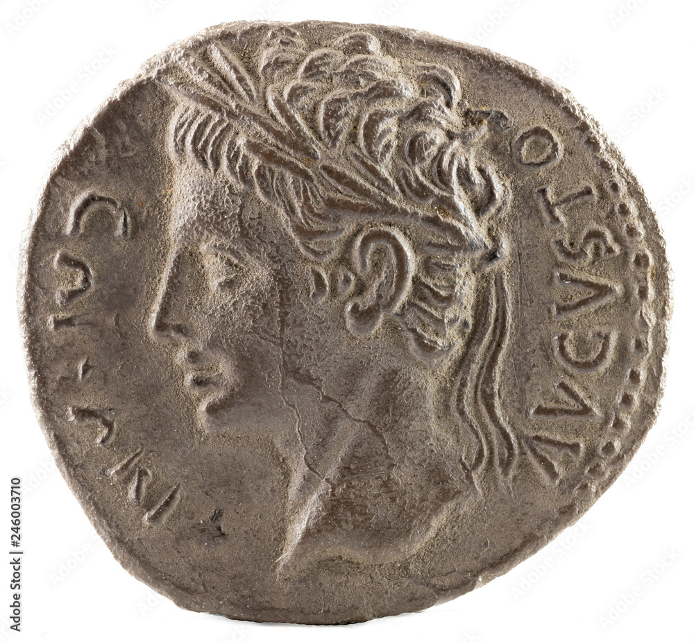 Ancient Roman silver denarius coin of Emperor Augustus. Obverse.