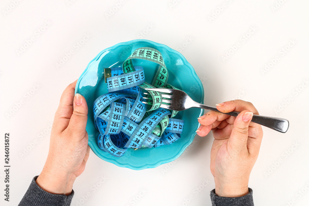 Empty plate with blue measure tape. Diet food concept. Weight loss concept.
