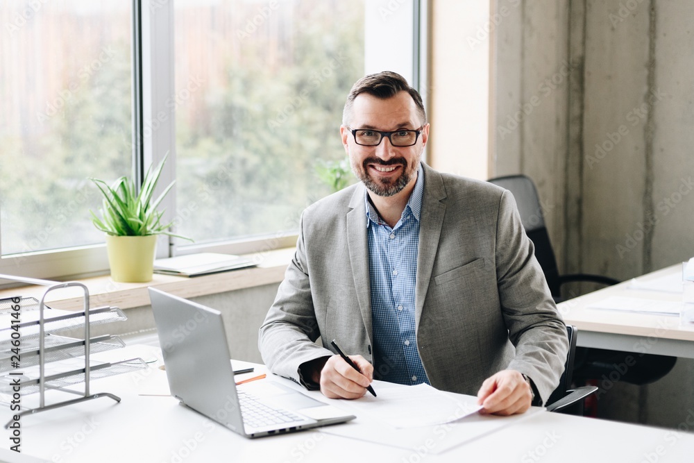 Happy middle aged handsome businessman in shirt working on laptop computer in office