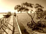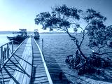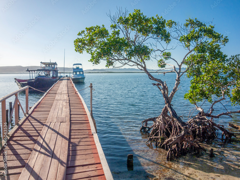 A pier in the middle of the mangroves at Cuba Island with a boat at the end of the dock over a quiet sea with a mangrove tree rising over the sea on an idyllic landscape during holidays