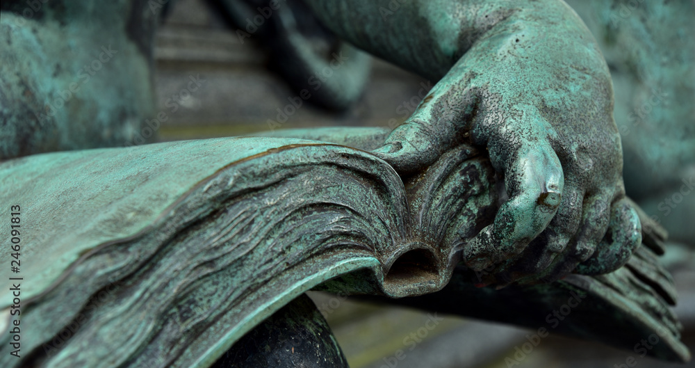 Detailaufnahme einer antiken Bronzestatue mit Buch in der Hand