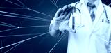 Medicine And Health Care Concept. Doctor Holds Test Tube In His Hand Share Results With Network. Healthcare Medicine Concept