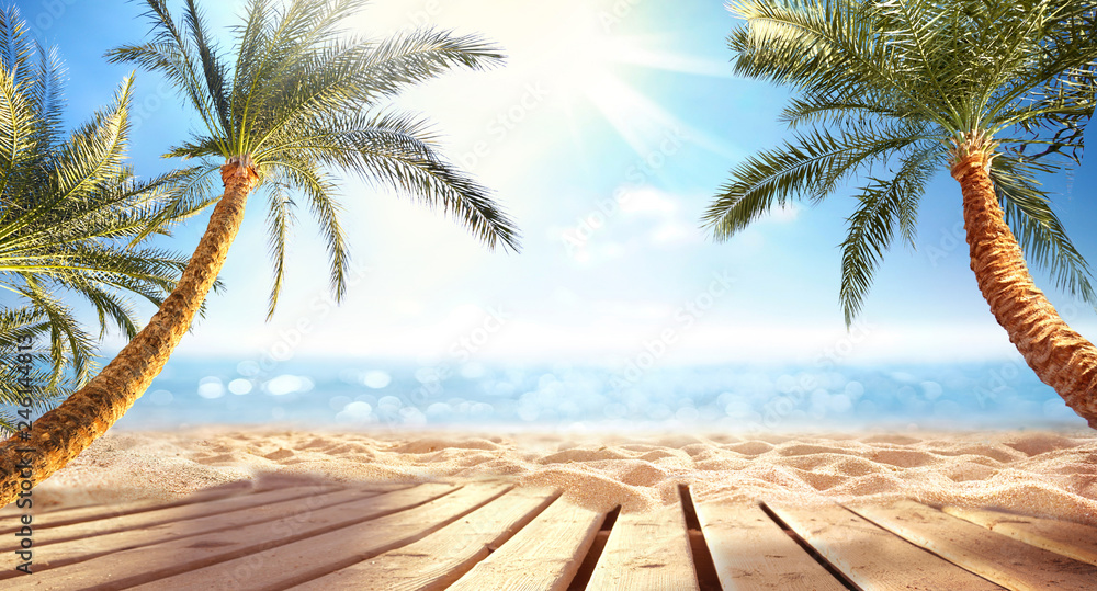 Summer panoramic landscape, nature of tropical beach with wooden platform, sunlight. Golden sand beach, palm trees, sea water against blue sky with white clouds. Copy space, summer vacation concept.