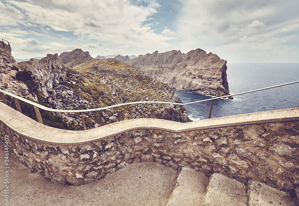 Stairs to the Formentor Cape lookout viewpoint, color toned picture, selective focus, Mallorca, Spain.
