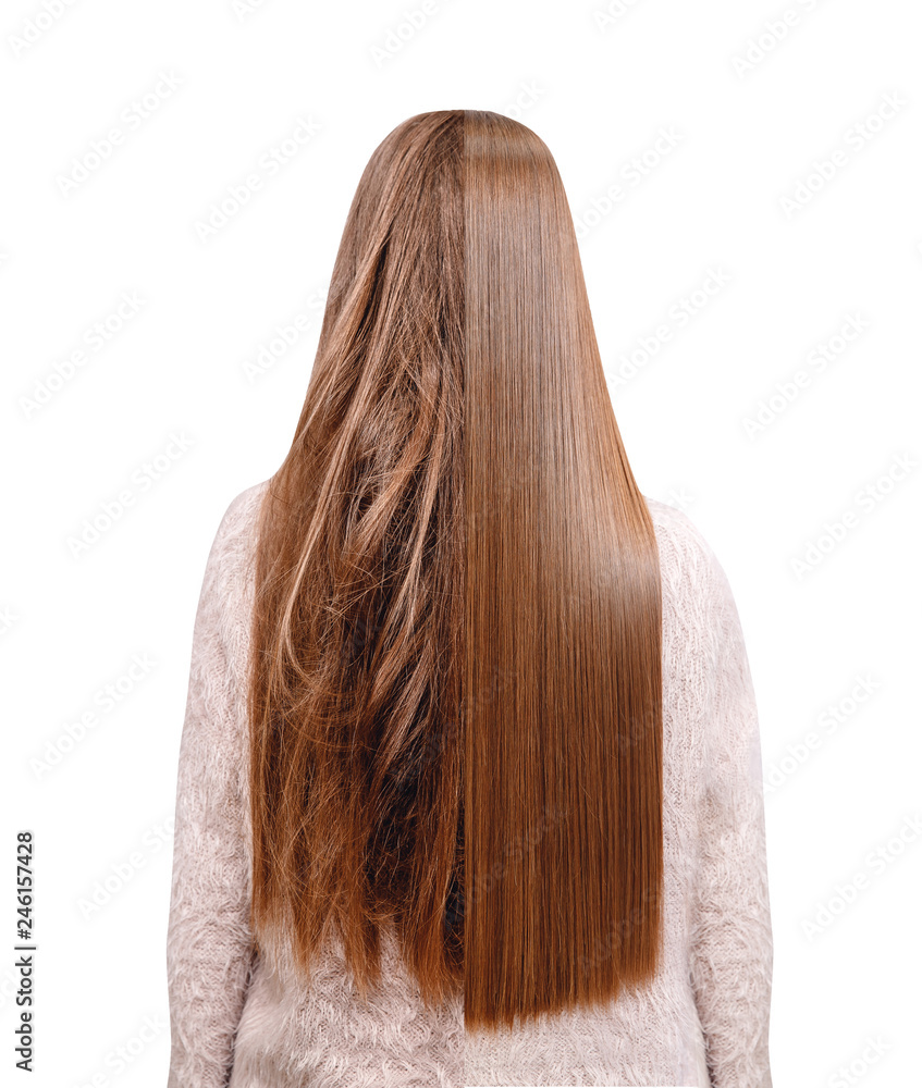 Sick, cut and healthy hair care keratin. Before and after treatment