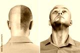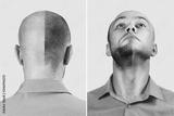 two happy Man before and after hair loss, transplant on background. concept of baldness: the first man photo in chin up, the second - behind
