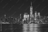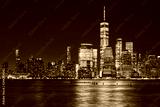 New York City business district skyline at night, color toning applied, USA.