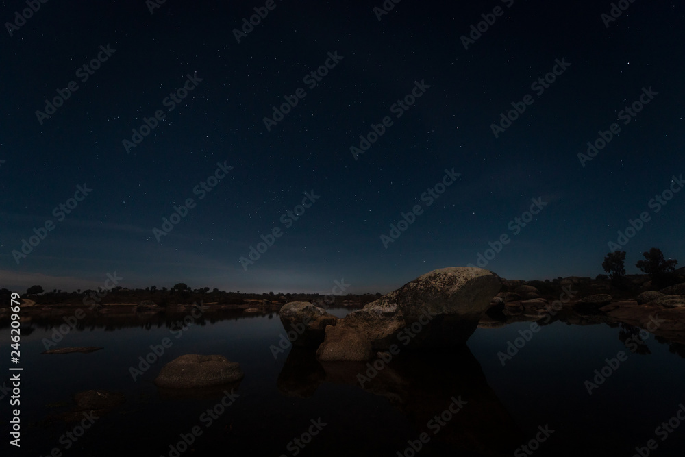 Night landscape with moonlight in the Barruecos Natural Area. Extremadura. Spain.