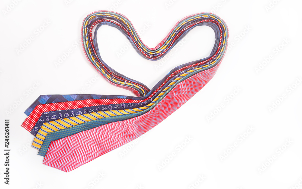 Concept of gift for men with men's ties in shape of heart on white backgroud. Minimal style of present for Valentine's day birthday, lifestyle. Outfit for businessman with love.