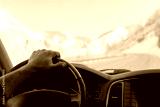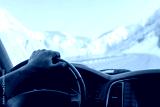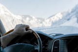 Close-up of a man's hand on the steering wheel of a car that moves on a snowy road among the mountains in the winter