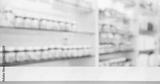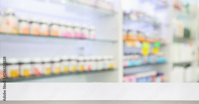 Pharmacy drugstore counter with medicine and vitamin supplement on shelves blur abstract background for montage healthcare product display