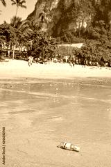 Empty glass bottle left on a beach, tourism development related environment littering concept, Thailand.