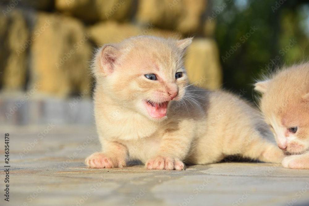 Two cute kittens playing outside. Adorable little yellow kitten learn to walk and play