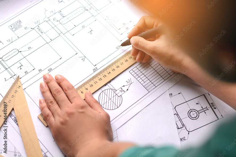Girl architect draws a plan, graph, design, geometric shapes by pencil on large sheet of paper at office desk. Soft focus
