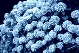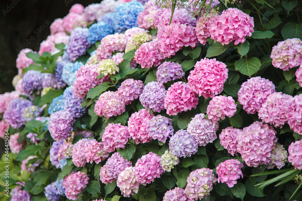 Hydrangea is pink, blue, lilac flowers. Bushes are blooming in spring and summer in town street garden.