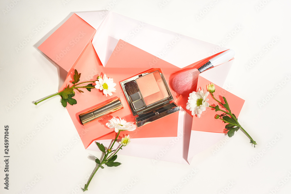 Beautiful green succulent inside a cup with llama and view of Peru and Machu Picchu isolated on living coral color background. copy space