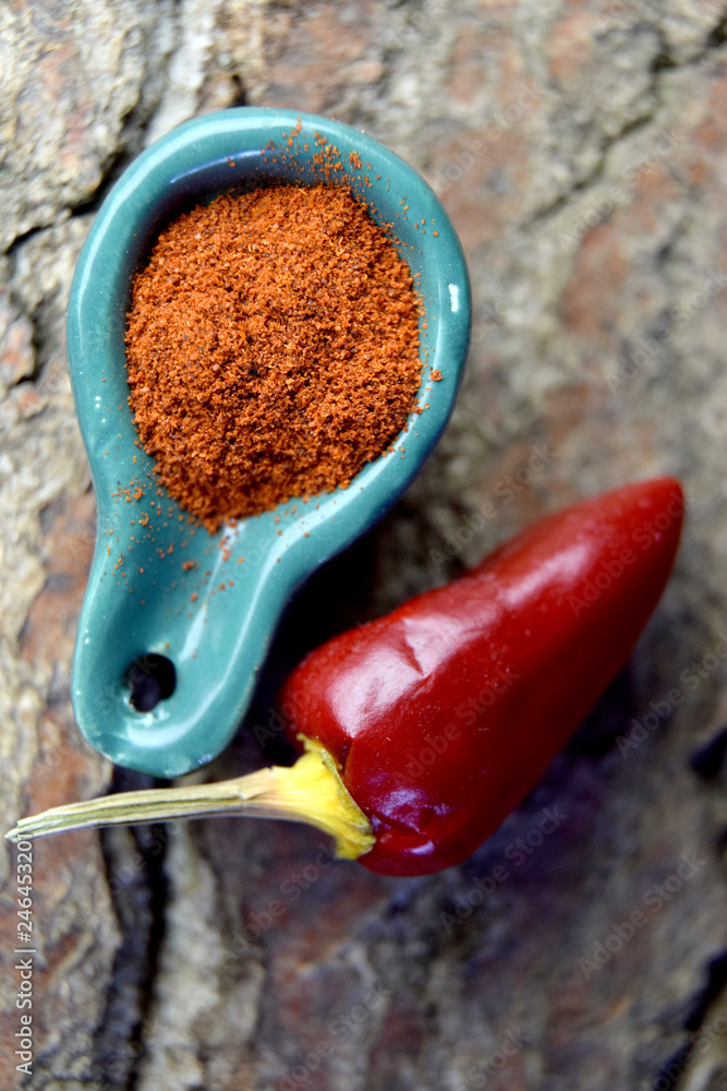 Raw ripe fresh red pepper with powder spice