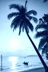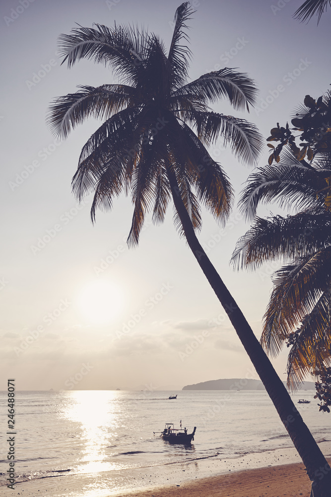 Tropical beach at sunset, focus on palm tree, color toned picture, Thailand.