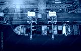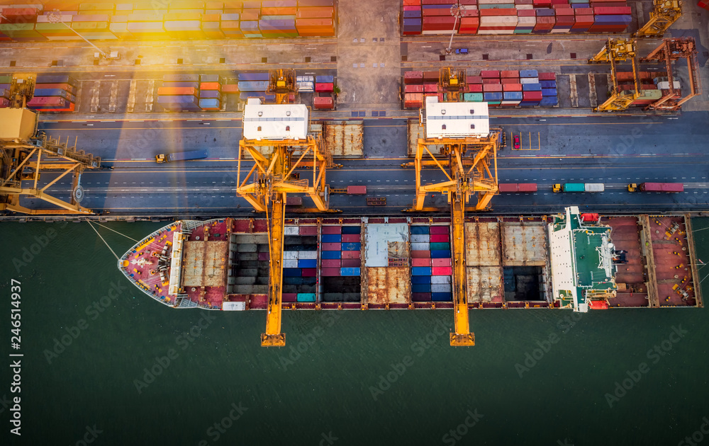 Logistics and transportation of Container Cargo ship and Cargo plane with working crane bridge in shipyard at sunrise, logistic import export and transport industry background