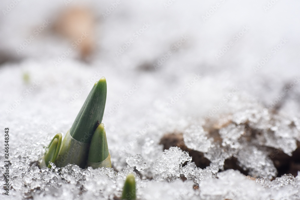First spring burgeon of snowdrops through the snow. Concept of spring and new life