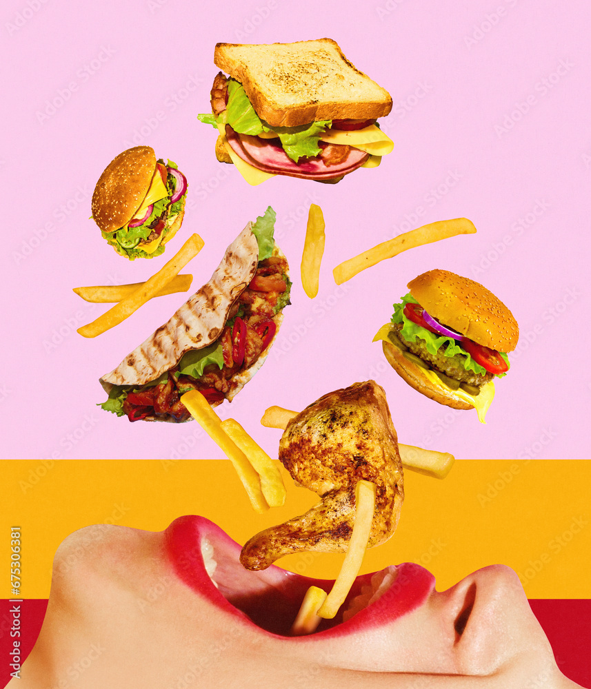 Сontemporary portrait a young woman showing her strength and biceps on a blue background in the style of light-music and elements of a collage. Sports concept on the theme of comics and Zine culture