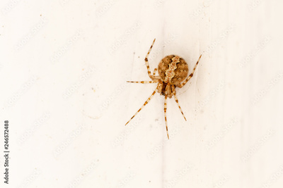 Araña de vistoso color y dibujo en interior de una vivienda. Arácnido.