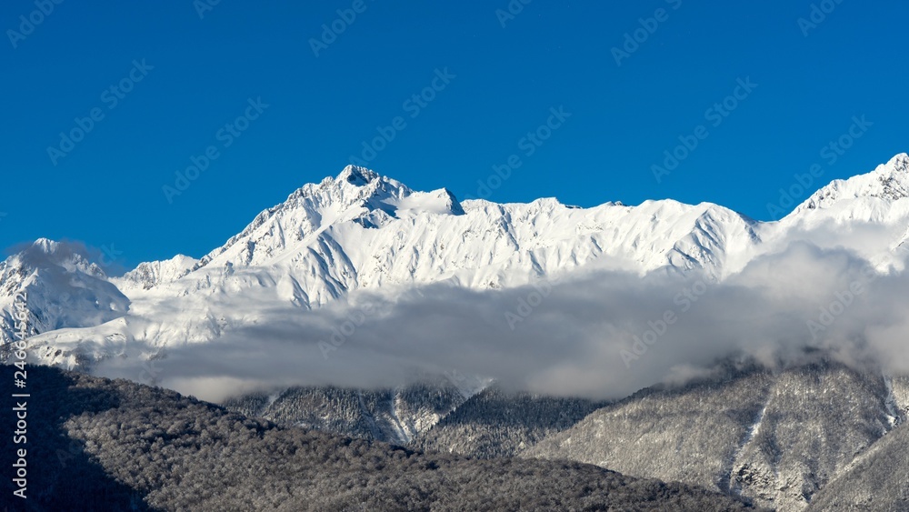 View of winter Caucasus Mountains and clouds from above, Krasnaya Polyana, Russia.